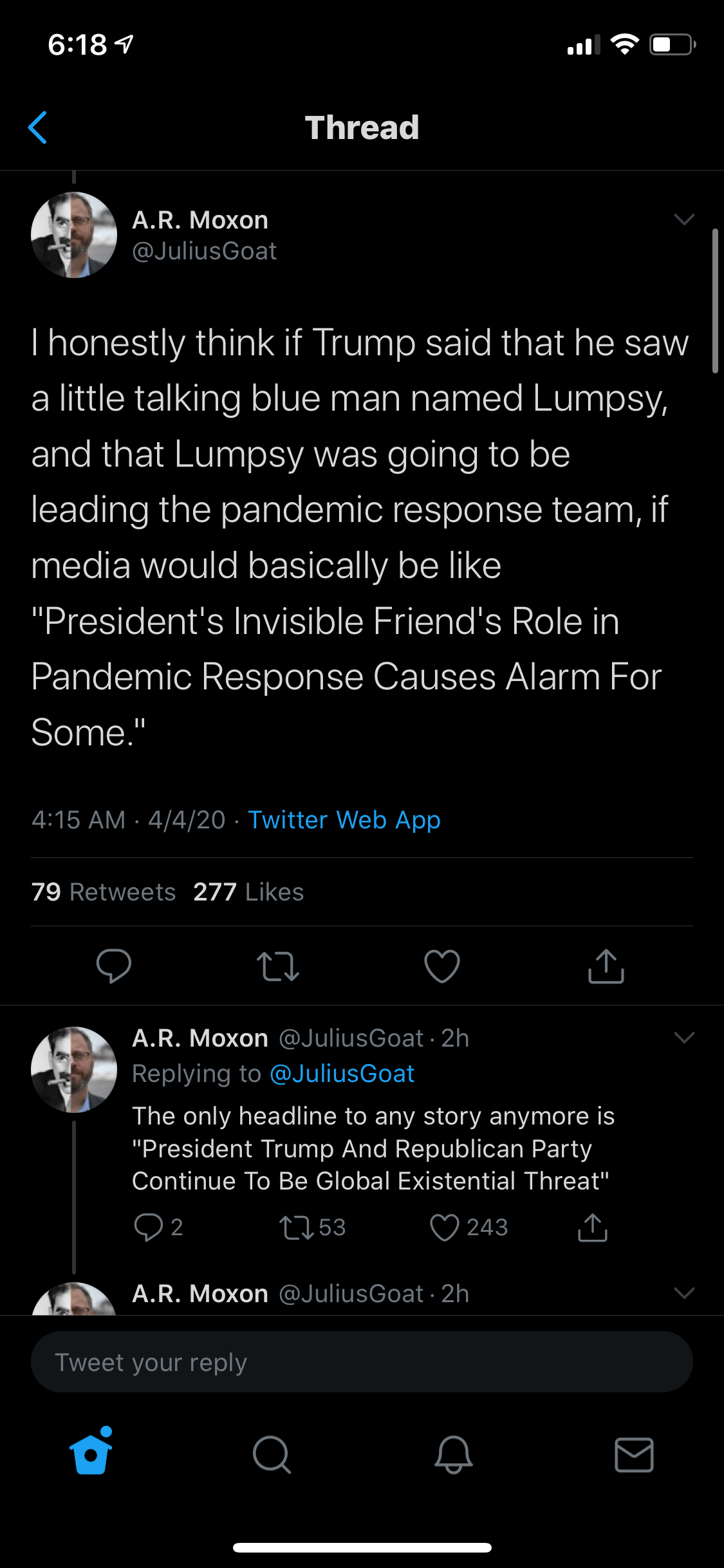 Hundreds of people dying in a day, makeshift hospital tents popping up in Central Park, bodies being loaded into refrigerated trucks, a Navy hospital ship pulling into the harbor—four weeks ago, this would have been dismissed as a wildly alarmist view of the coronavirus in NY. &emdash;@mckaycoppins